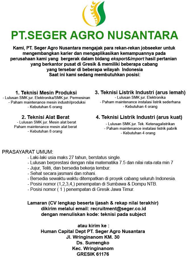 PT Seger Agro Nusantara adalah salah satu anak perusahaan PT Sumber Energi Pangan Triputra Group. Wringinanom Gresik 61176 Jawa Timur Telp. Profil PT Seger Agro Nusantara. Informasi berikut merupakan sebuah lowongan pekerjaan terbaru dari PT seger Agro nusantara tahun 2020. Lihat juga info lowongan dari PT Seger Agro Nusantara dengan total 0 lowongan.